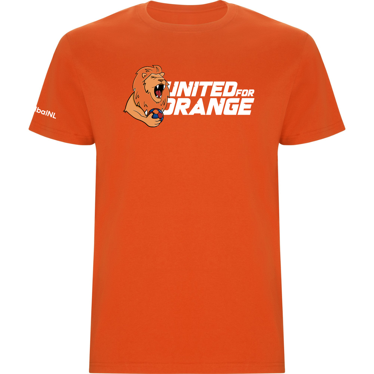 United for Orange T-shirt II – Unisex – supportershirt met groot logo op de borst, crest-logo op de rug en HandbalNL-logo op de rechter mouw. 100% katoen, Oeko-Tex Standard 100.