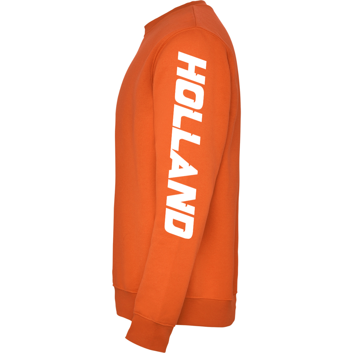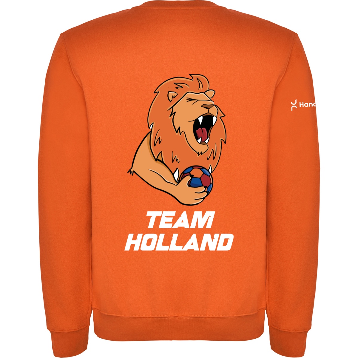 Bedrukt met groot United for Orange-logo op de borst en rug, HandbalNL-logo op de linkermouw en grote HOLLAND-print op de rechtermouw.